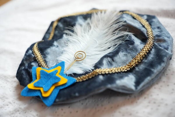 Dit pietenmutsje is in de kleur blauw met een gouden band van en gekleurde vilten sterretjes.